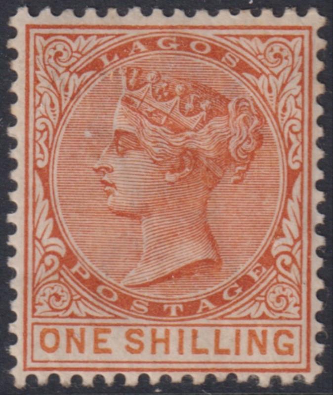 Lagos 1885 1/- QV orange, crown CA wmk. SG 26. Cat £23. Mint. (Image)