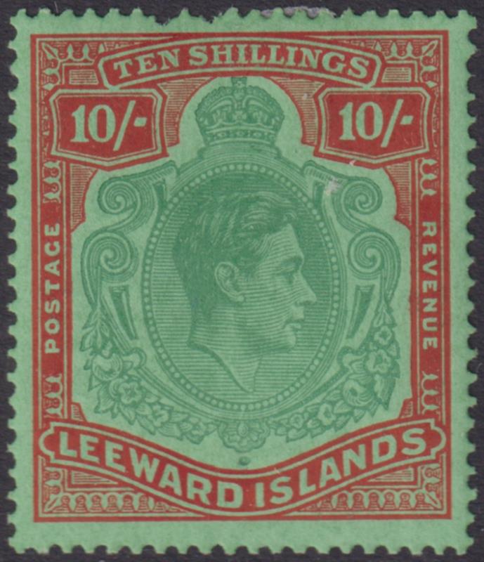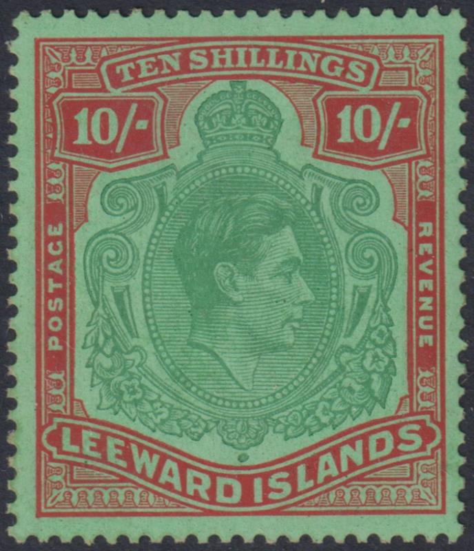 Leeward Isl 1944 10/- GVI chalky paper, 2 pulled perfs at top. SG 113. Cat £200. Mint. (Image)