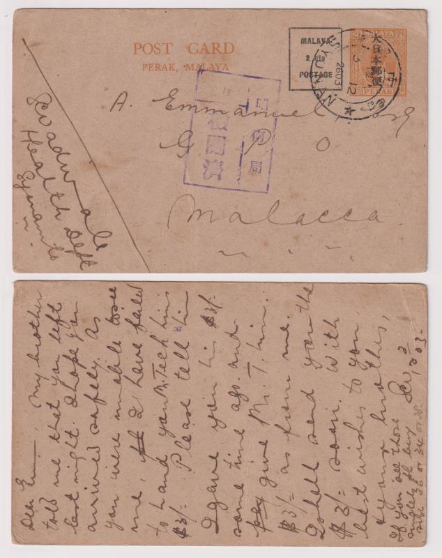 Malaya-Japanese Occupation 1943 2c postal stationery p/c with purple censor's h/s to Malacca ex SYNON 3 Dec with message (hand