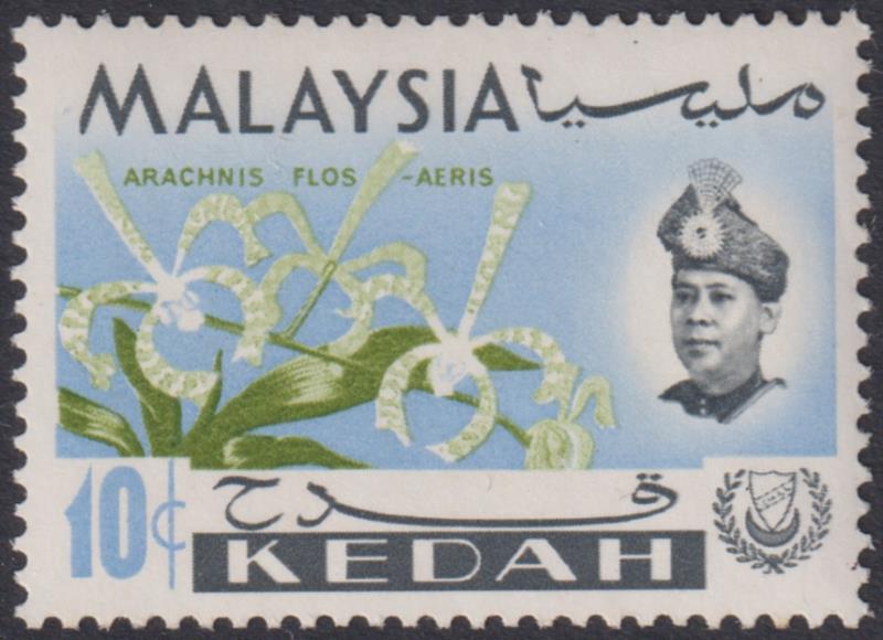 Malaya-Kedah 1965 10c Orchid error: red colour omitted. SG 119a. Cat £850. MUH. (Image)