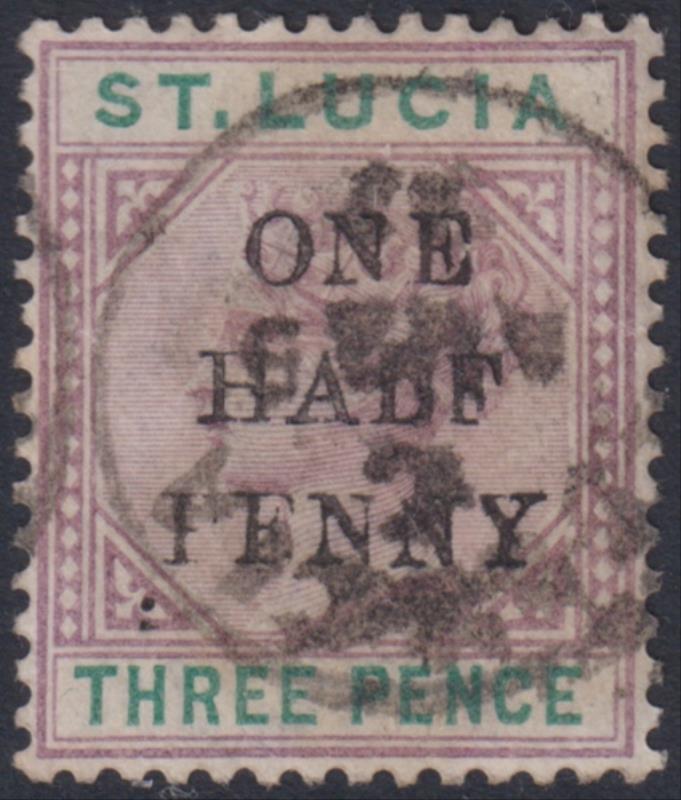 St Lucia 1891 "ONE HALF PENNY" ovpt on QV 3d dull mauve & green. SG 56. Cat £29. GU/FU. (Image)