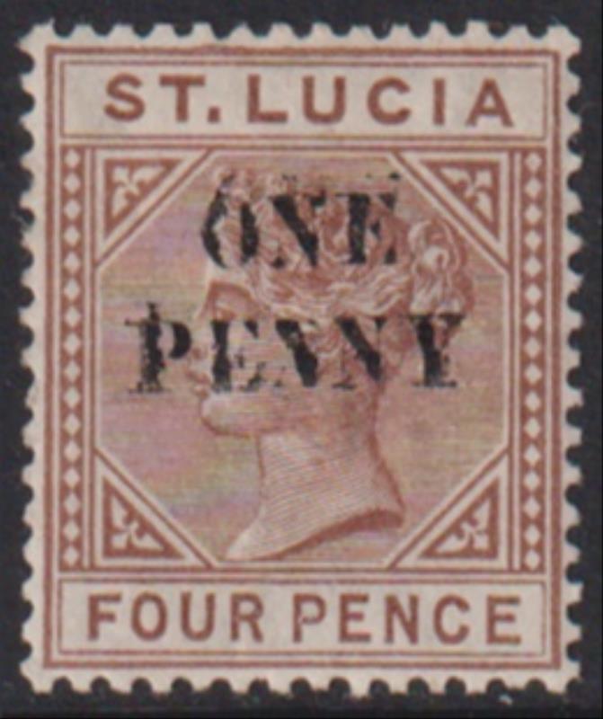 St Lucia 1891 1d on 4d QV, brown, Type II ovpt (thick "N") error - double surcharge. SG 55ca. Cat £475. Mint. (Image)