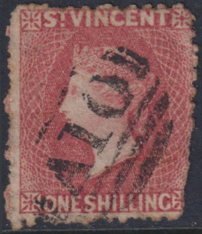 St Vincent 1873 1/- lilac rose, p11 to 12½ x 15, star wmk sideways. Very rough perfs & part stamp apparently missing at