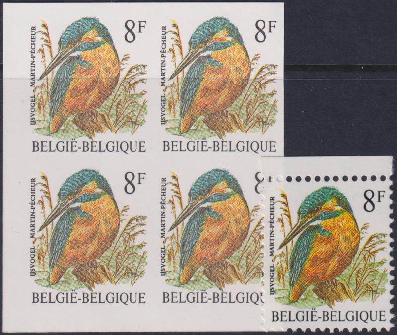3102 * imageBelgium 1986 8F Kingfisher error: lower left sheet corner imperf block of 4, with normal (single) for comparison. Belgian Stamp Dealer's cat 2240. Cat €220. MUH. (Image)
