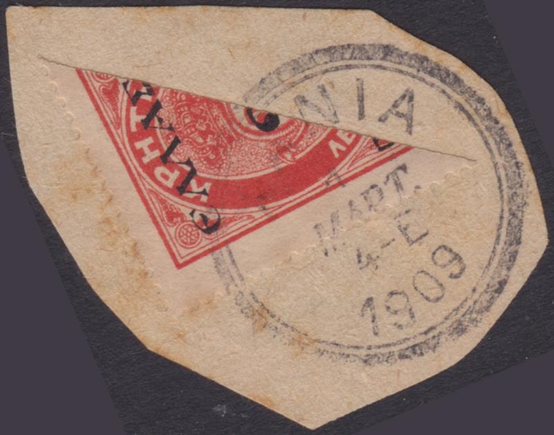 3113 U imageCrete 1909 2L-20L red bisect on piece. Scott 102b. FU. (Image)