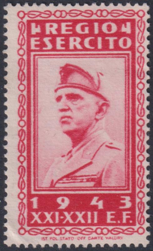 3163 imageItaly 1943 WWII "Regio Esercito [Royal Army] / XXI-XXII E.F." red, propaganda label (Mussolini). Cinderella. MNG. (Image)