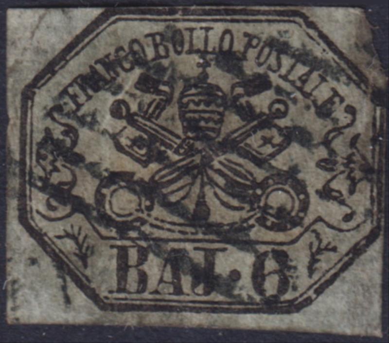 3165 U imageItaly-Papal States 1852 6b Arms black on greenish grey, imperf about 2 margins. SG 23. Cat £110. FU. (Image)