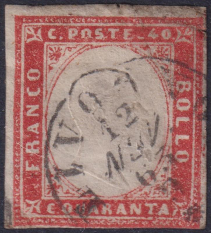 3167 U imageItaly-Sardinia 1863 40c King Victor Emmanuel embossed pale red, imperf 3 margins, cut to frame on 4th side. SG 55. Cat £70. FU. (Image)