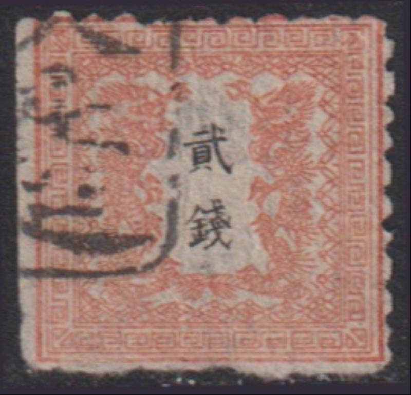 3168 U imageJapan 1872 2s vermilion, vertically laid paper clearly p11 on 2 sides, others rough. Scott 7. Cat US$475. FU. (Image)