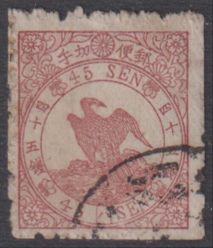 3169 U imageJapan 1875 4s Goshawk (bird) carmine, syll 3 (plate 3), p14 (rough as usual). SG 63. Cat £450. FU. (Image)