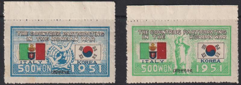 3180 M* imageKorea-South 1951 Italy (with Crown) Korean War Participant set. SG 168a,b. Cat $100. Mint/MUH. (Image)