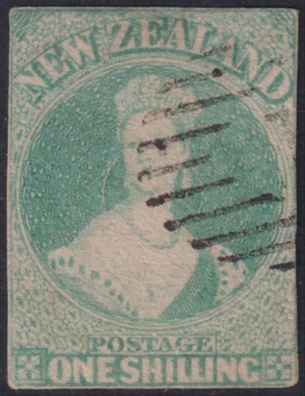 FFQ 1/- dull emerald-green, imperf no obvious margins, very close all 4 sides, no wmk. Usual light back thins & light crease.
