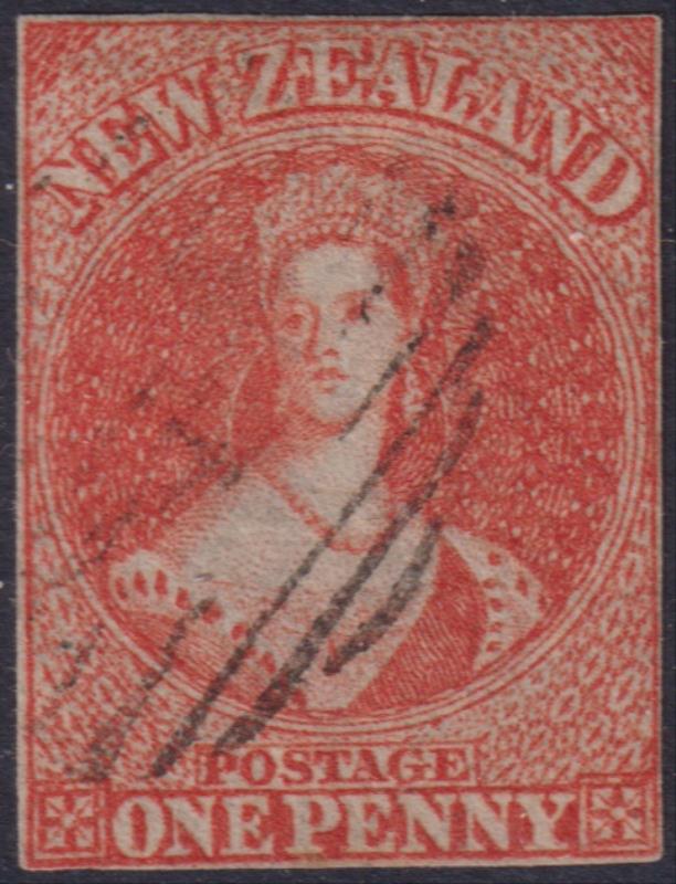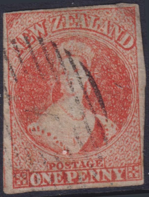 FFQ 1d vermilion, imperf 3 margins, star wmk, light creasing, smudged pmk but clear of face. SG 34. Cat £350. GU. (Image)