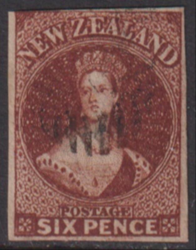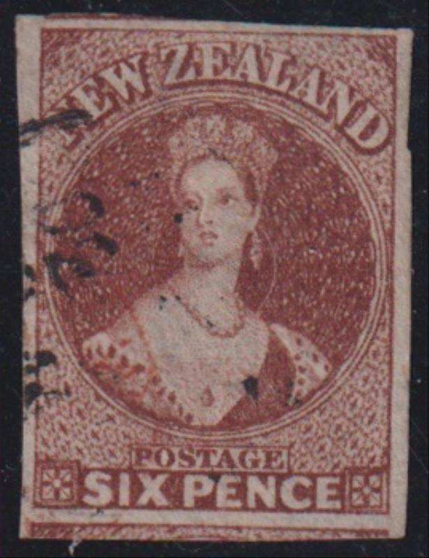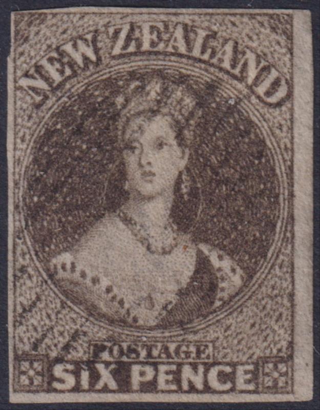FFQ 6d chestnut, imperf 3 margins, light fold top right with 1mm edge weakness. Fine "17" barred cancel. SG 15. Cat £950.