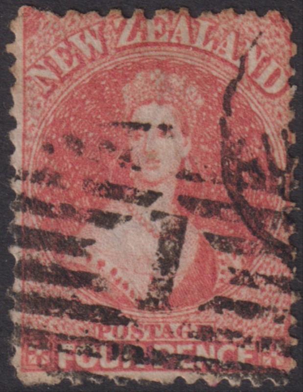 FFQ 4d rose, p12½ (a few short perfs), heavy barred cancel part on face. SG 119. Cat £300. GU.
