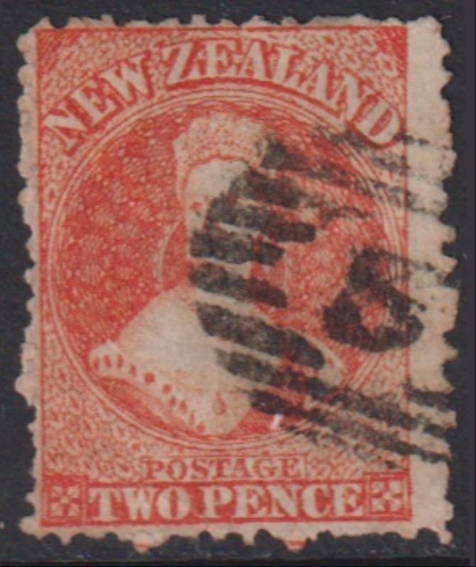 FFQ 2d vermilion, p12½, NZ wmk, clear barred "8" cancel (Wanganui). SG 141. Cat £500. GU/FU.