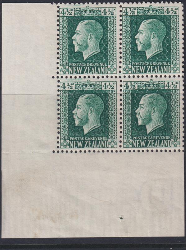 1915 4½d GV deep green lower left sheet corner block of 4, p14 x 13¼. CP K6a. Cat $360. Stamps MUH, hinge remnant on