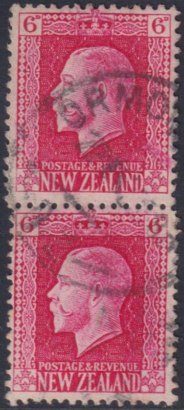 1915 6d GV carmine-pink vert 2 perf pair. Canc partial Ormondville cds, 1918. Appears non-philatelic. CP K8c(2). Cat $325.