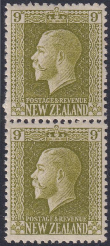 1915 9d GV sage-green vert 2 perf pair. CP K11c. Cat $275. Upper stamp mint, lower MUH. (Image)