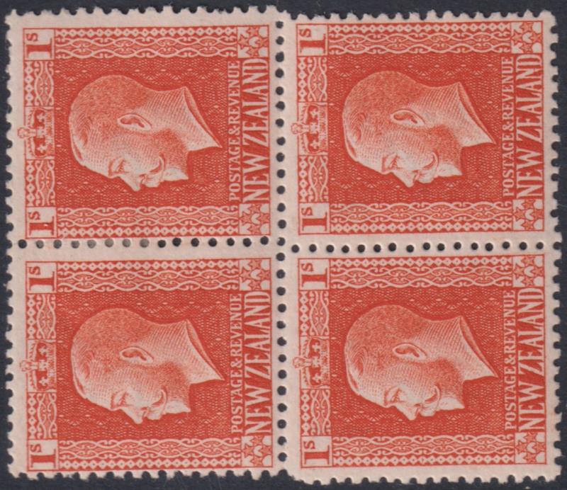 1915 1/- GV vermilion asymmetric block of 4, incl 2 vert 2 perf pairs. Two short perfs. CP cat $1100. Mint. (Image)