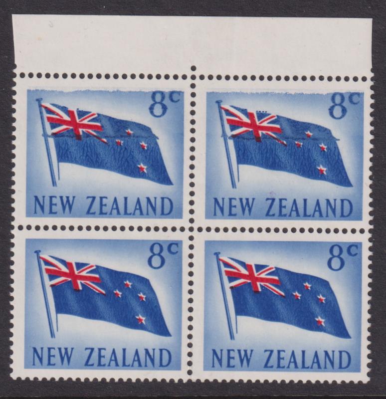 1967 8c Flag upper selvedge block of 4 with 3 varieties: a) upper pair with horiz (blue) doctor blade flaw at base of Union