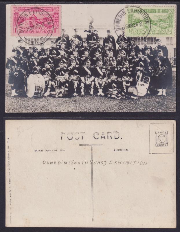 1925 ½d & 1d Dunedin Exbn on b/w R.P of Highland band players & instruments with Dunedin Exbn 16 March "J" class cancels.