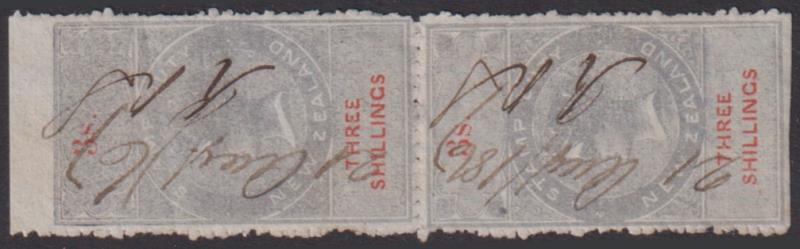 1867 3/- QVLT grey & red vert pair, die I, NZ wmk (invtd & reversed), variety H-roulette, except imperf at top & bottom of