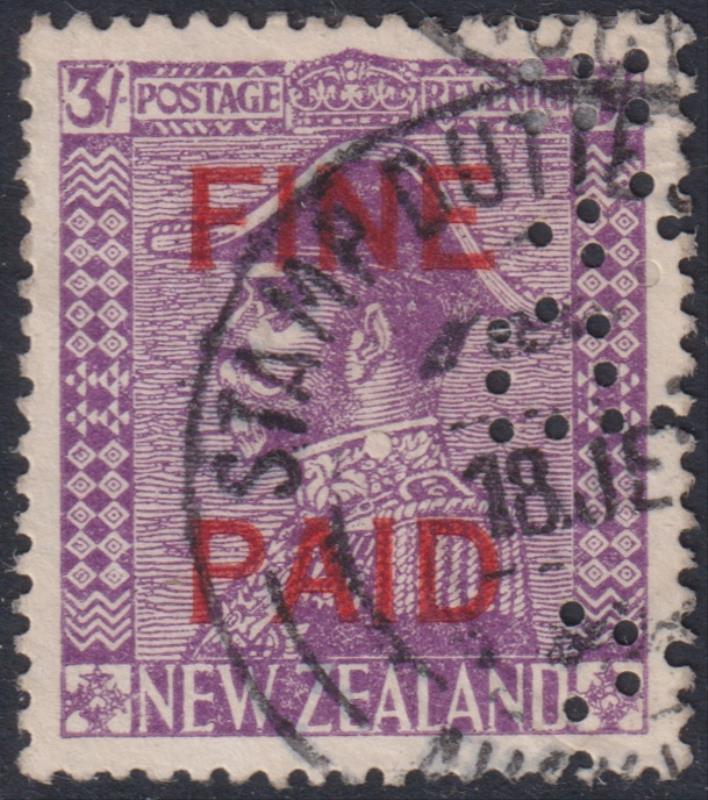 1927 3/- Admiral mauve, Cowan paper, with "FINE PAID" red ovpt. With steel fiscal cds, embossing & perfin puncture cancels.