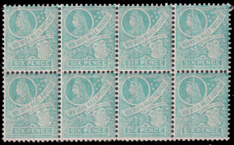 NSW 1898 6d emerald-green, horiz block of 8, p12, with invtd wmk, attractive. SG 297fb. Cat £280 as mint. 2 mint/6 MUH. (Image)