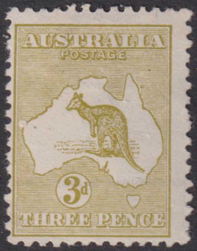 1913 3d Roo yellow-olive, Die I, broad crown over A wmk. SG 5c. Cat £95. Mint. (Image)