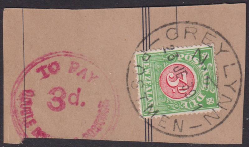 1937 3d Postage Due on large piece tied by complete "23 JE 39 GREY LYNN POSTMEN" cds, WT, p14 x 15. CP Y18c. Cat $90.