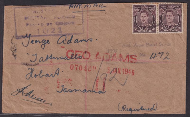 2370 C image1942 PNG WWII OAS reg'd air cover to Tattersall's in Hobart, franked Aust GVI 3d x 2, canc 2 fine strikes of "A.I.F, FIELD P.O. No. 24" cds 11 DE 42. On back, further fine strike, also good "ARMY POST OFFICE 060" cds & 2 receipt b/s. Also, on front, fin (Image)