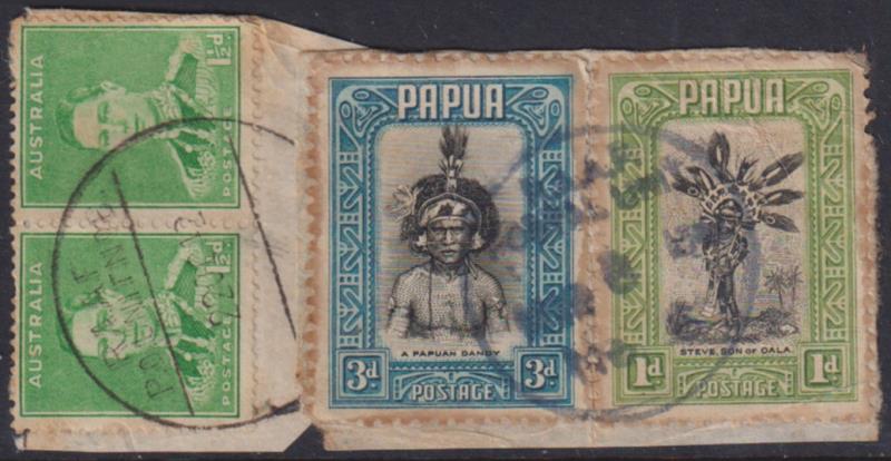 2376 U image1942 PNG (Papua) WWII "R.A.A.F./POSTAL UNIT/No. 6" temporary rubber cds, good complete strike MAR (?) 8 1942 on Papua 1d & 3d pictorials on piece. Rare (known only March-April 1942). Also complete strike of the replacement "R.A.A.F./P.O. UNIT No. 6" ste (Image)
