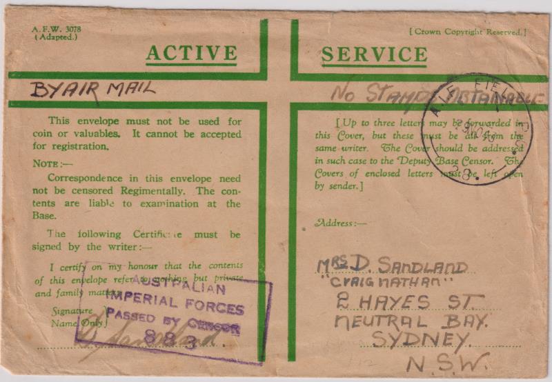 2373 C 1942 PNG WWII stampless OAS air cover (with Aust YMCA imprint), to Australia, canc fine "A.I.F. FIELD P.O. No. 12" cds 11 NO 42 & with fine circ crowned censor 168 h/s (violet). D/s used at No. 7 B.P.O. Port Moresby, Papua Sept 1942-May 9143. On back, "