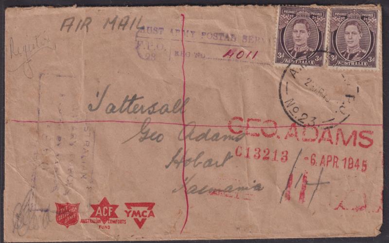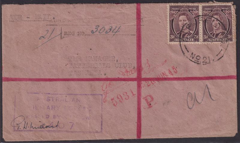 1945 PNG WWII OAS reg'd air cover to Tattersall's in Hobart, franked Aust GVI 3d x 2, canc good strike of "A.I.F. FIELD P.O.