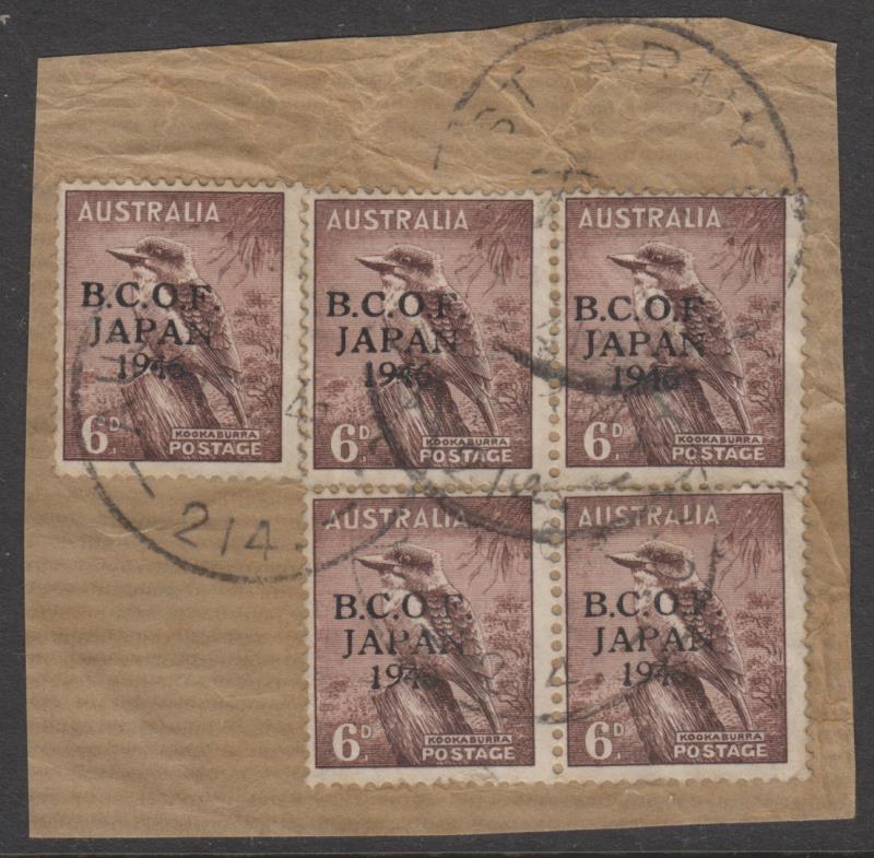 1946 6d BCOF x 5 (single & 2 pairs) on small piece in 1948. SG J4. Cat £145. FU. (Image)