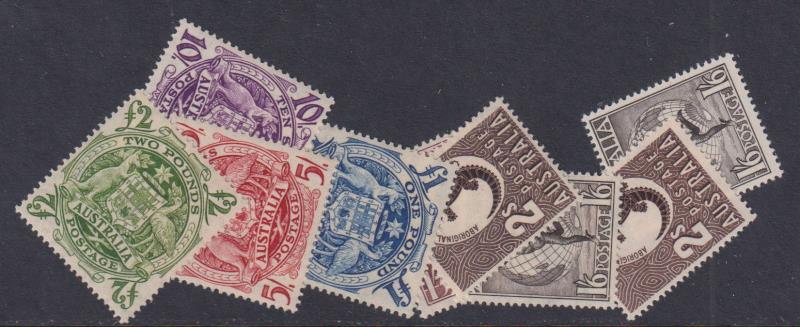 1948-56 Arms set of 4 (to £2) plus no wmk vars of 1/6d and 2/-defin vals. SG 223-224f. Cat c£160. Mint. (Image)