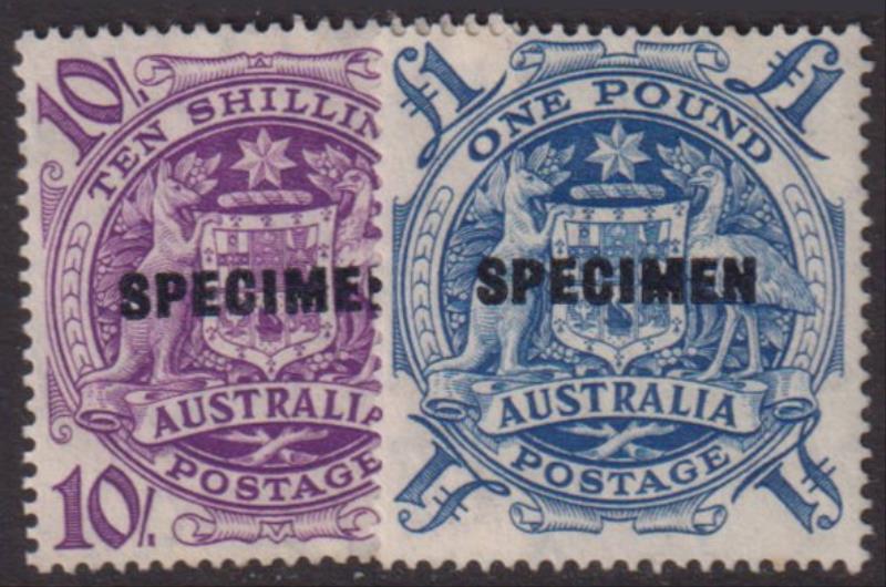 1949-50 10/-, £1 Arms - SPECIMEN ovpt. SG 224bs,cs. Unused no gum. (Image)