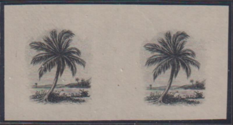 Cook Isl 1920 (3d) Palm Trees imperf centre plate proof horiz pair in black (design also used for Aitutaki, Penrhyn & Niue). (Image)