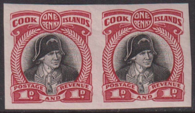Cook Isl 1932 1d Capt Cook imperf plate proof horiz pair, issued colours, gummed unwmk paper. (Image)