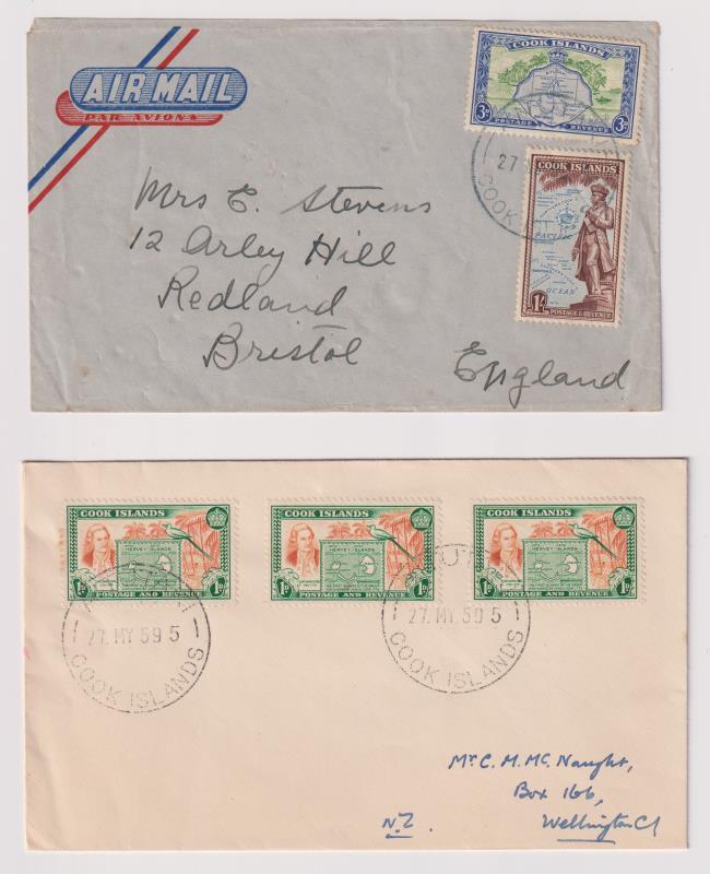 Cook Isl 1950s "AITUTAKI/COOK ISLANDS" 33 mm J-type cds on 2 covers: (a) 27 NO 5(?), air cover to GB with 3d, 1/- 1949