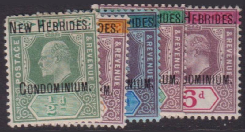 2682 M imageNew Hebrides 1908 ½d to 6d EVII, wmk crown CA. SG 4-8. Cat £62+. Mint. (Image)