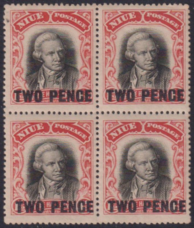 2695 M* imageNiue 1931 2d on 1½d Captain Cook block of 4 (2 mint/2 MUH). SG 50. Cat £22 as mint. (Image)