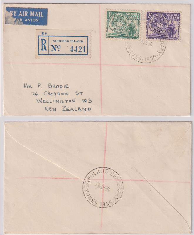 2715 U imageNorfolk 1956 Centenary set of 2 on plain regd air FDC to NZ. Special commem cds 8 JE 56 on stamps & fine strike as b/s. Fine. SG 19, 20. (Image)