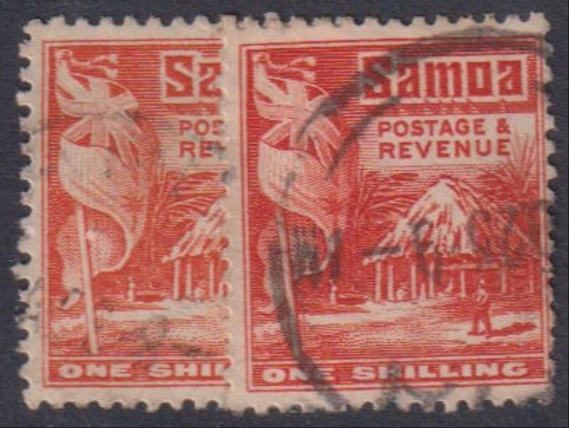 2822 U imageSamoa 1921 1/- Hut, 2 really contrasting shades (vermilion, deep vermilion). SG 164. Cat £52+. FU. (Image)