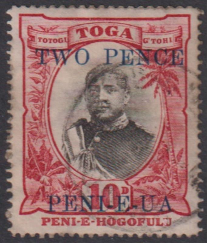 Tonga 1920 2d on 10d KGII, invtd tortoises wmk. SG 66. Cat £75. FU. (Image)