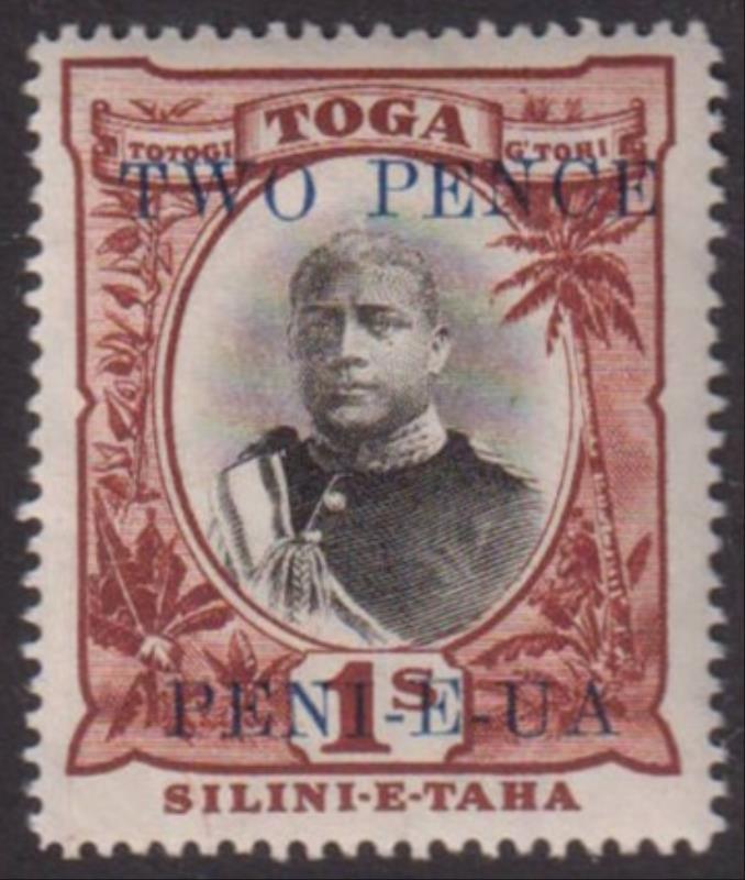 Tonga 1923 2d on 1/-. SG 67. Cat £75 as mint. MUH. (Image)