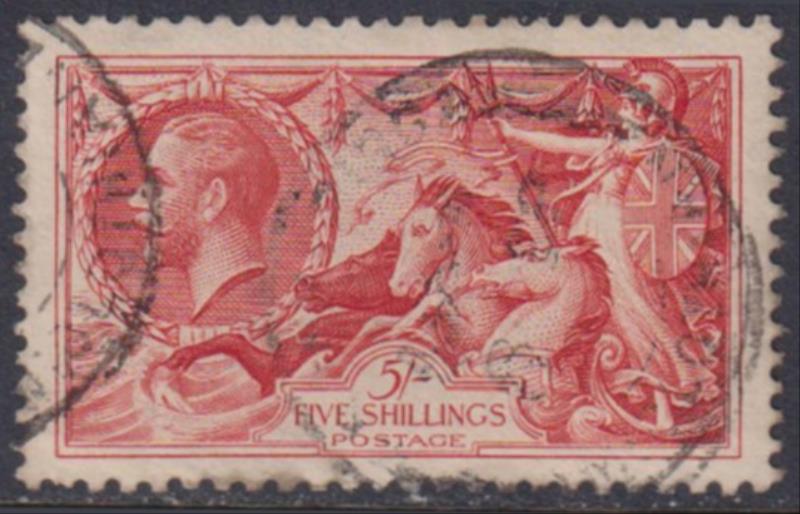 1934 5/- Seahorses re-engraved (x 2 cdss). SG 451. Cat £85. FU. (Image)