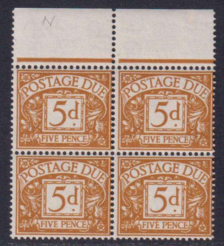 1956 5d Postage Due, upper selvedge block of 4, St Edwards crown wmk. SG D52. Cat £100. MUH. (Image)