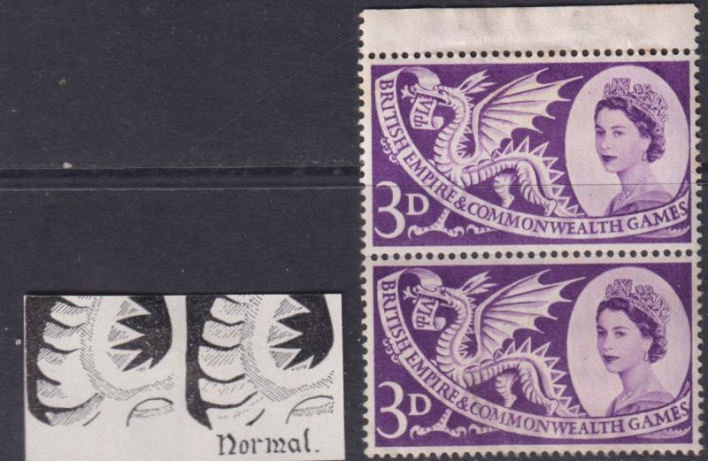 1958 3d Commonwealth Games, "short scale" flaw (CYL 2 dot R7/1) in vert pair with top selvedge. Minor gum faults. SG Spec